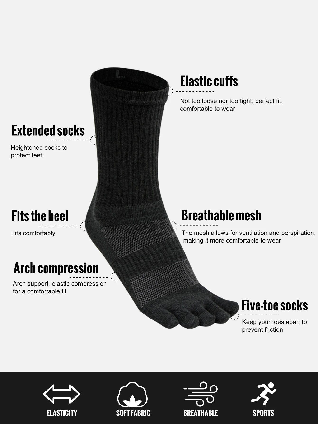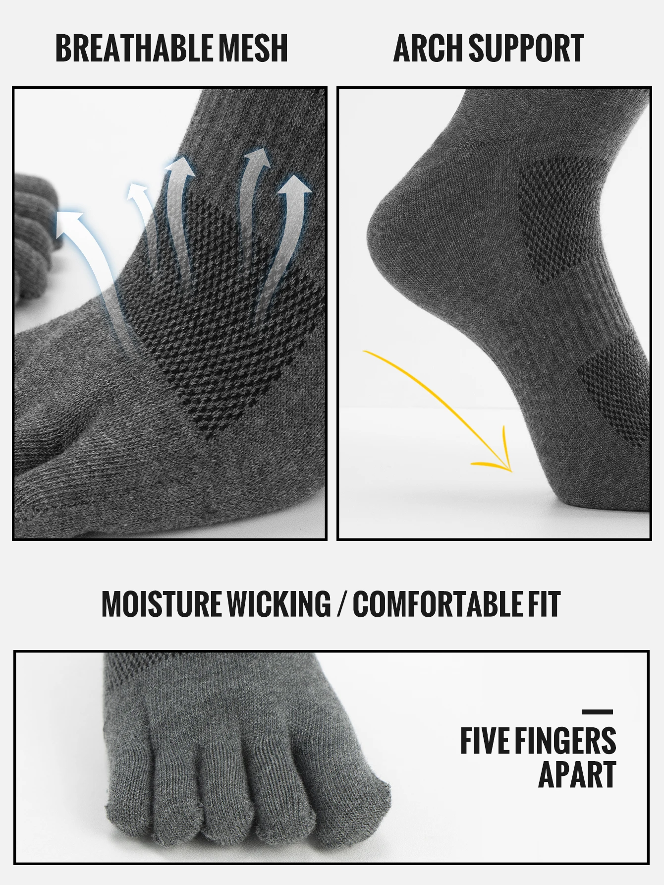 Five-finger Design: Unique five-finger structure reduces friction between toes, helps prevent blisters and enhances mobility.